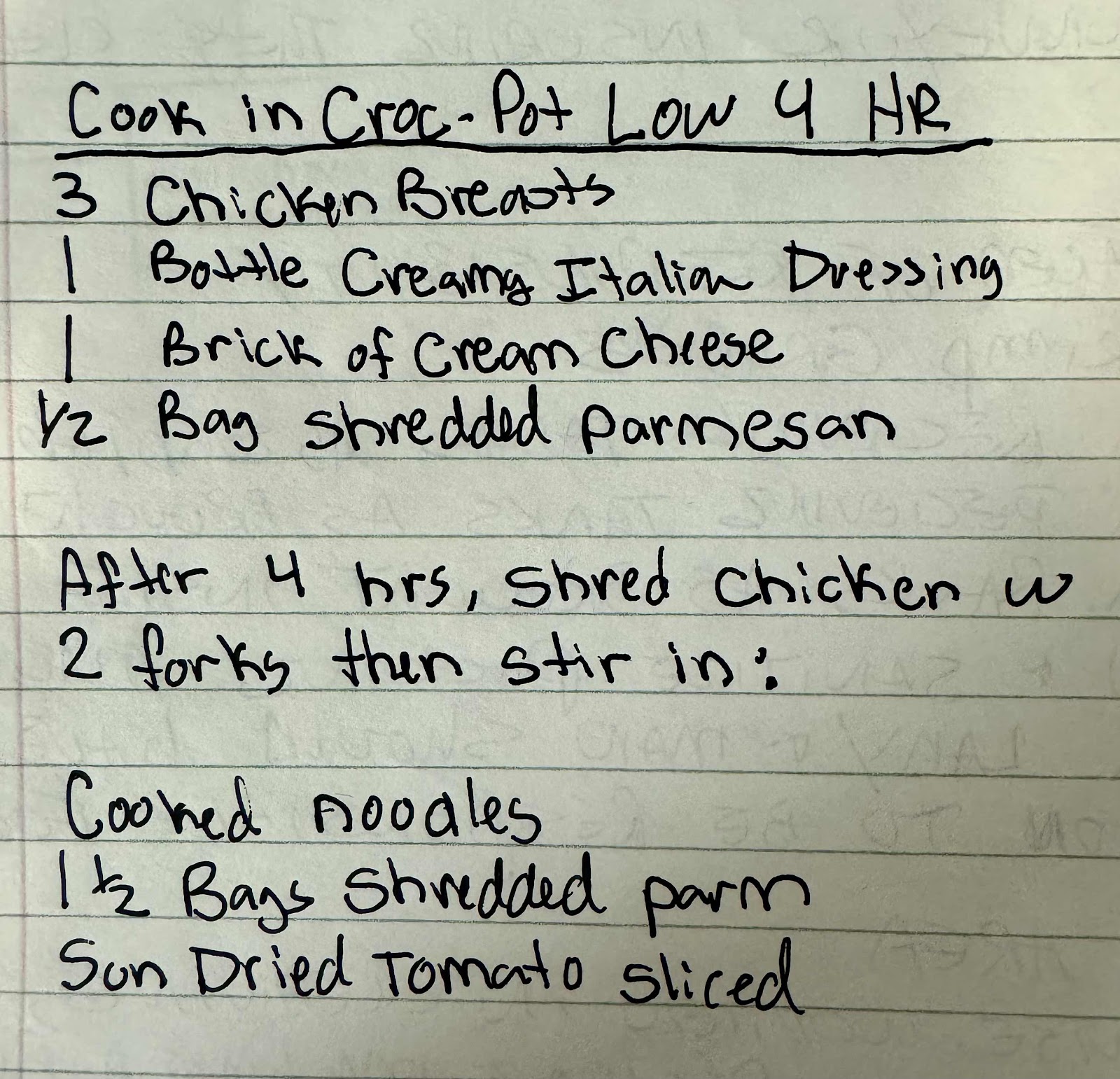 From Barefoot Neighbor Place ingredients in crockpot in this order: 2# LEAN ground beef (raw) Season beef w: S&P, Chili Powder, & Garlic Powder 1 chopped onion 1 chopped bell pepper 1 chopped deseeded jalapeño 1 small can green chilis 1 can pinto beans drained and washed 1 can black beans drained and washed 1 can beef stock 1 can diced tomatoes 6 oz can cento tomato paste 1 packet chili seasoning Stir everything on top (leave beef alone) Cook on high 4 hours or 6-8 on low  Half way through, chop up beef and stir into chili season more if needed (s&p, hot sauce, etc) Serve w Fritos, sour cream & shredded cheese