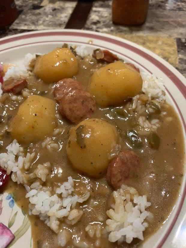 In large pot, makie a roux with oil and flour. When roux is brown, add potatoes, sausage, onions and seasonings. Let saute adding water as needed until potatoes are done and gravy is thickened. Serve over rice.