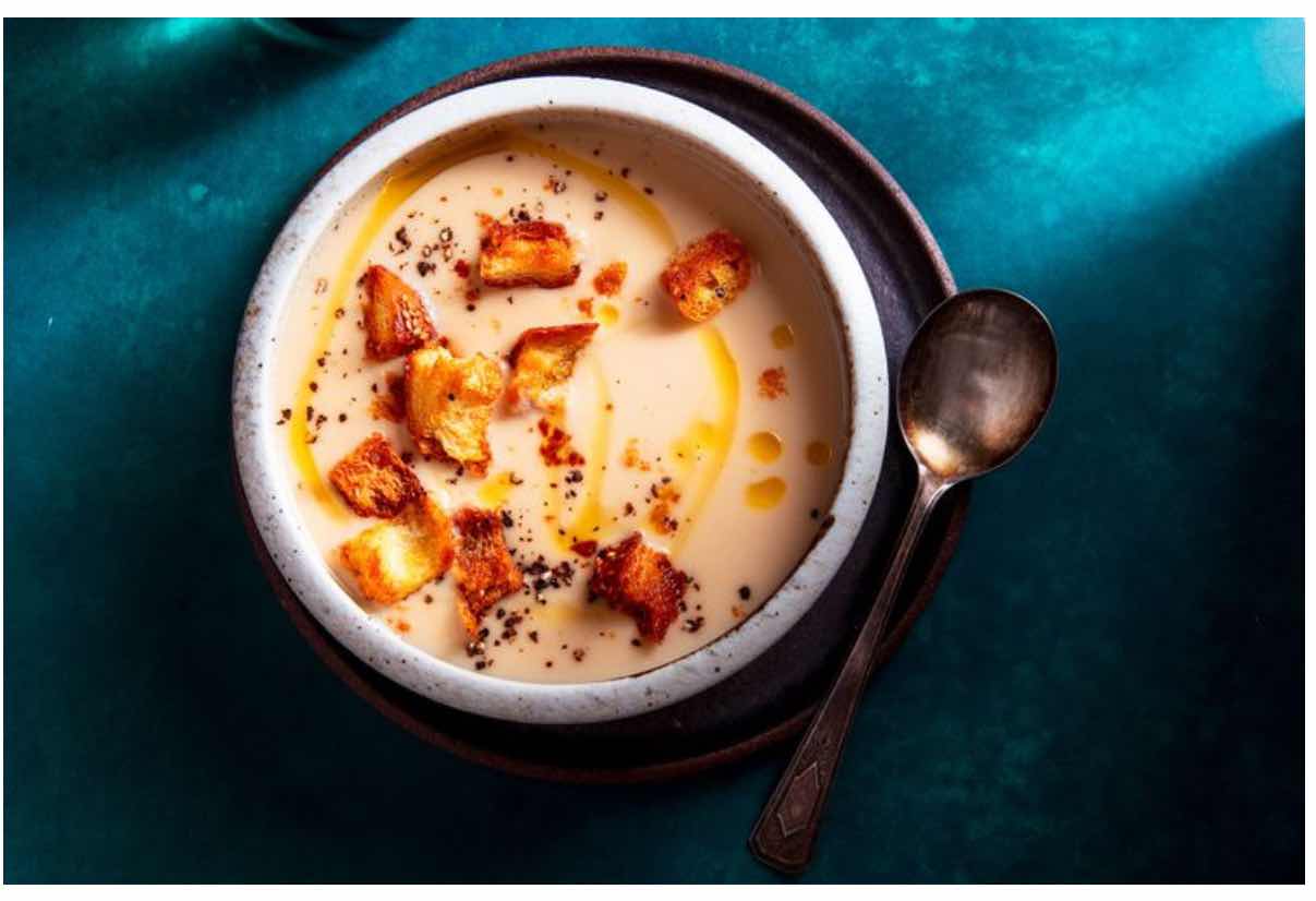 Remove the bouquet garni and discard. Puree the soup with an immersion blender or in a blender or food processor (let the soup cool a bit before pureeing it in a blender or food processor and puree it in small batches so the steam doesn't force the lid off the top). Strain the soup back into the pot. Add the half-and-half and pepper and bring back to a boil. Serve topped with the croutons, if you like.