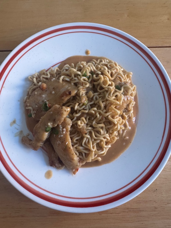 - 1 (3-ounce) pack instant ramen noodles, flavor packet discarded, 85grams