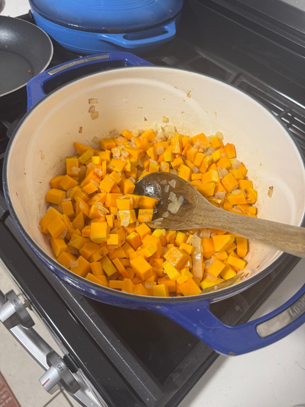 Reduce heat to medium and add the butternut squash. Cook this mixture, stirring occasionally,