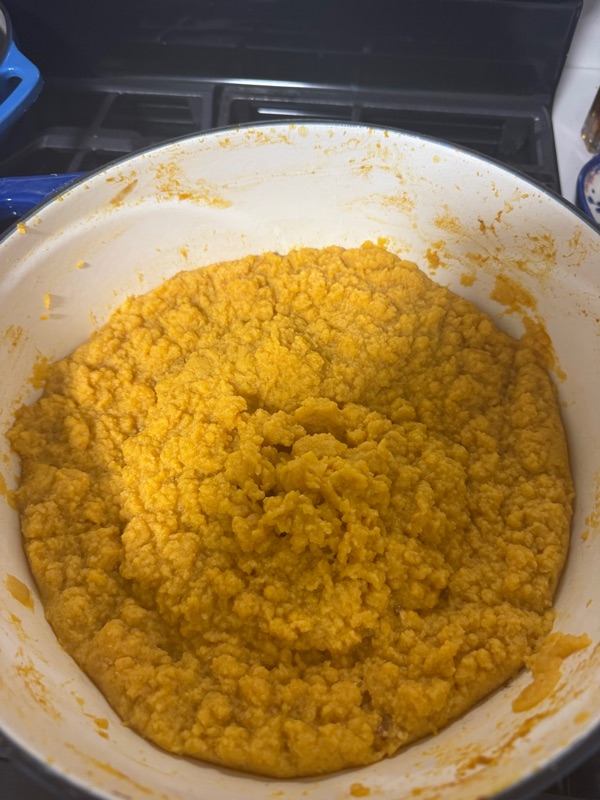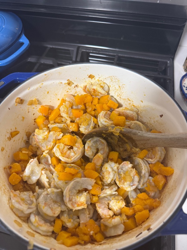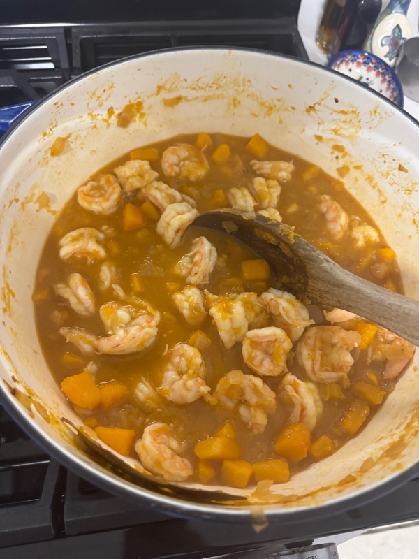 we had this great bisque at Brigsten’s on our first visit. A few things: This is a very time consuming recipe if you’re cooking it the first time. You’ll have extra shrimp stock. Freeze it in batches for future batches. One Butternut squash made enough cubes for 2 batches so I cut up and froze half of it for next time. The recipe made (4) containers of soup.