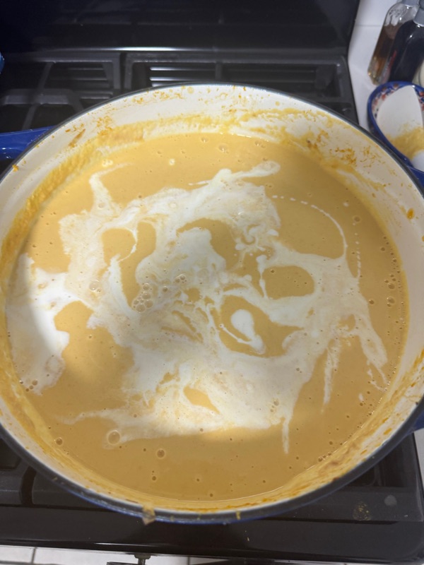 Remove bay leaf and discard. Transfer the squash/shrimp mixture to a food processor and puree. (I used a stick emulsifier) Return the puree to a saucepan and add the cream. Whisk until thoroughly blended.