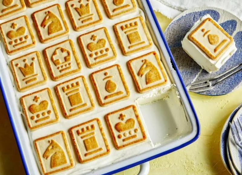 10. Arrange final layer of shortbread across the top—for best results do not crowd the cookies—you want them to line up with the bottom layer of cookies, making it easier to slice later (slices beautifully). Push them into the pudding mixture just slightly.